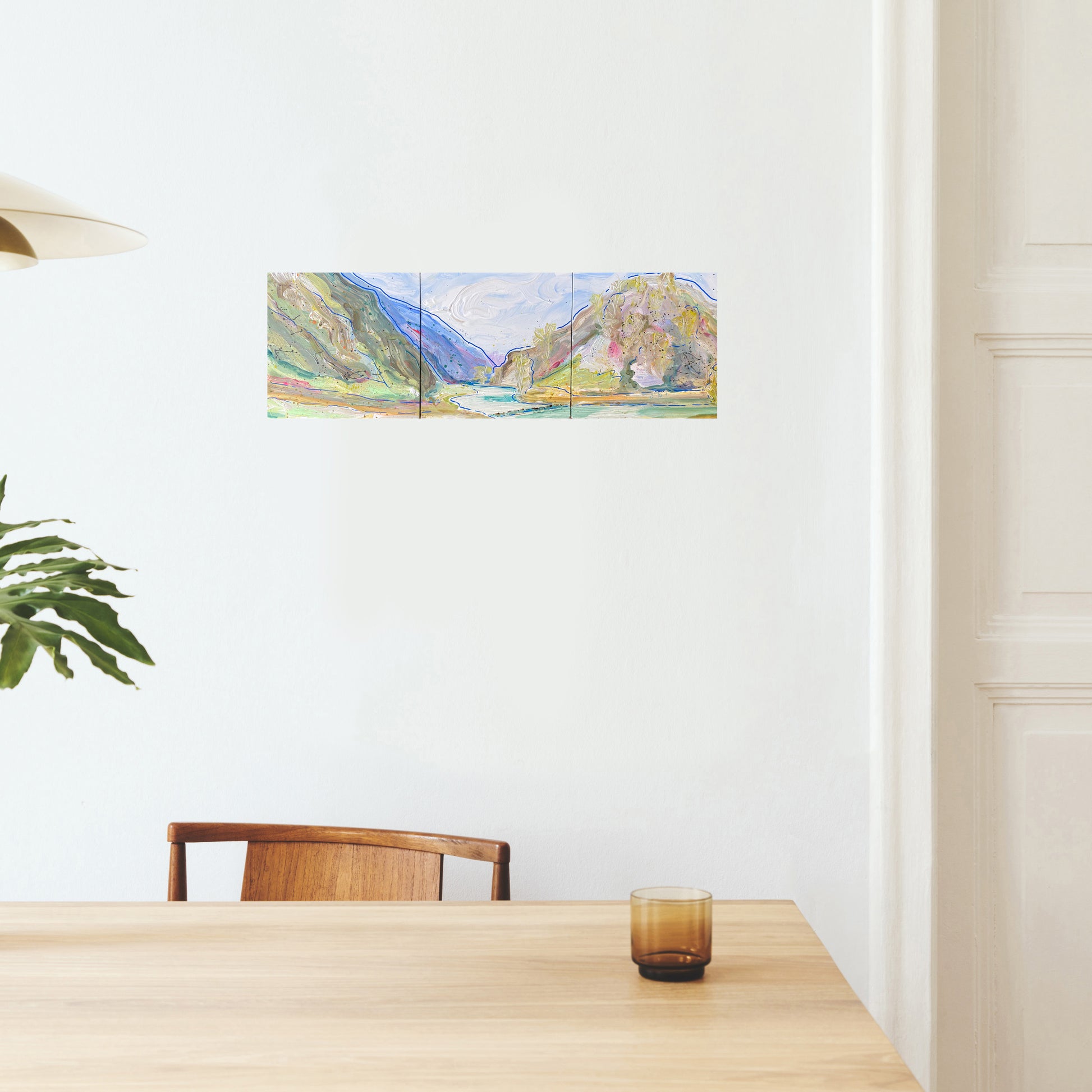 Rendered on premium Gesso block, the triptych format allows you to display the work as an integrated piece or arrange the panels individually to suit your interior layout. The vibrant hues and layered brushwork characteristic of contemporary landscape painting create visual interest from multiple viewing distances, making this an engaging focal point for any room.