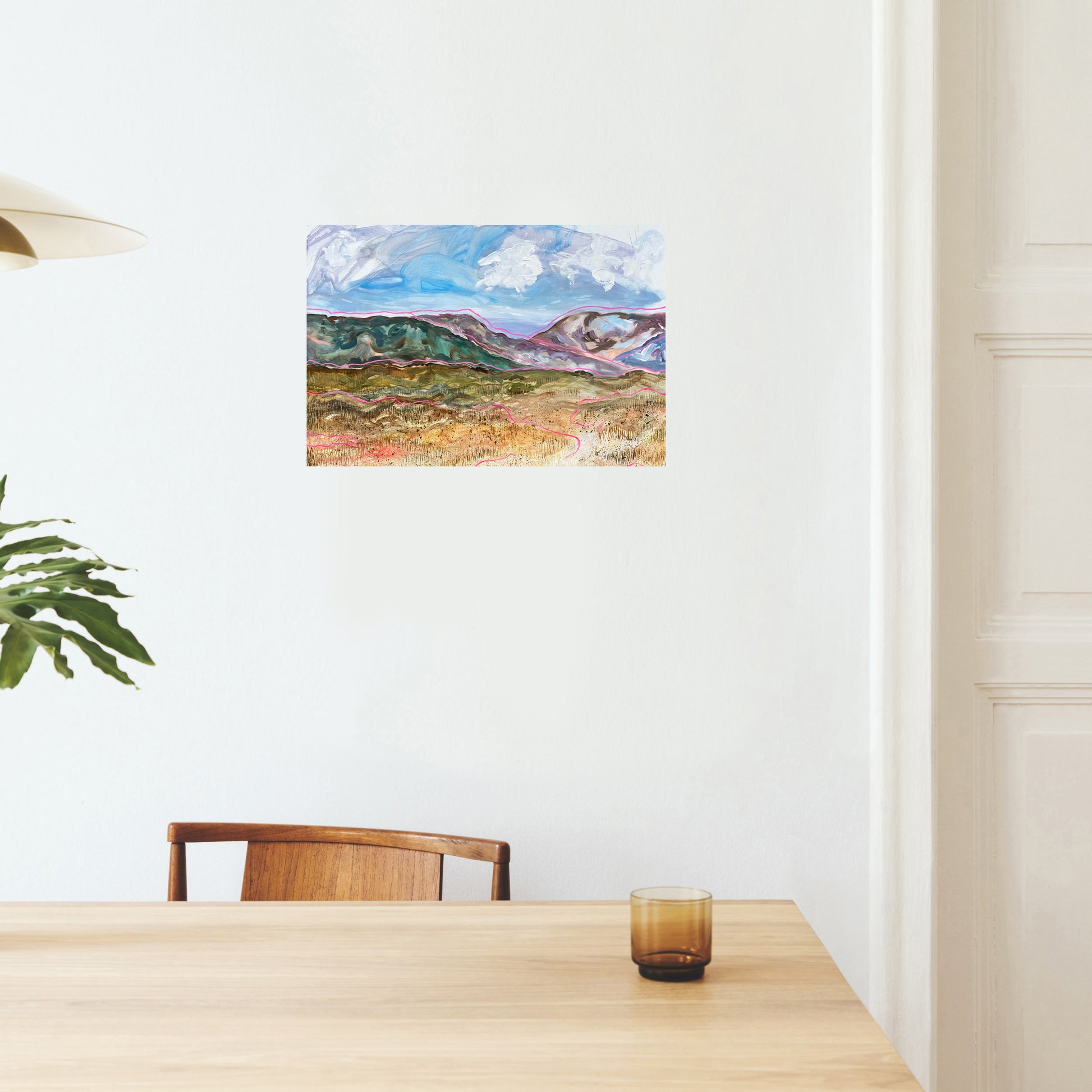 “Peat Bog” is a sweeping interpretation of upland terrain, where earth, mist, and sky dance in tension and harmony. With layered mark-making, gestural strokes, and a vibrant but grounded palette, this artwork invokes a sense of solitude, wildness, and deep place‑memory. The contrast between rough textures and soft transitions invites contemplation, offering viewers both drama and calm in equal measure.